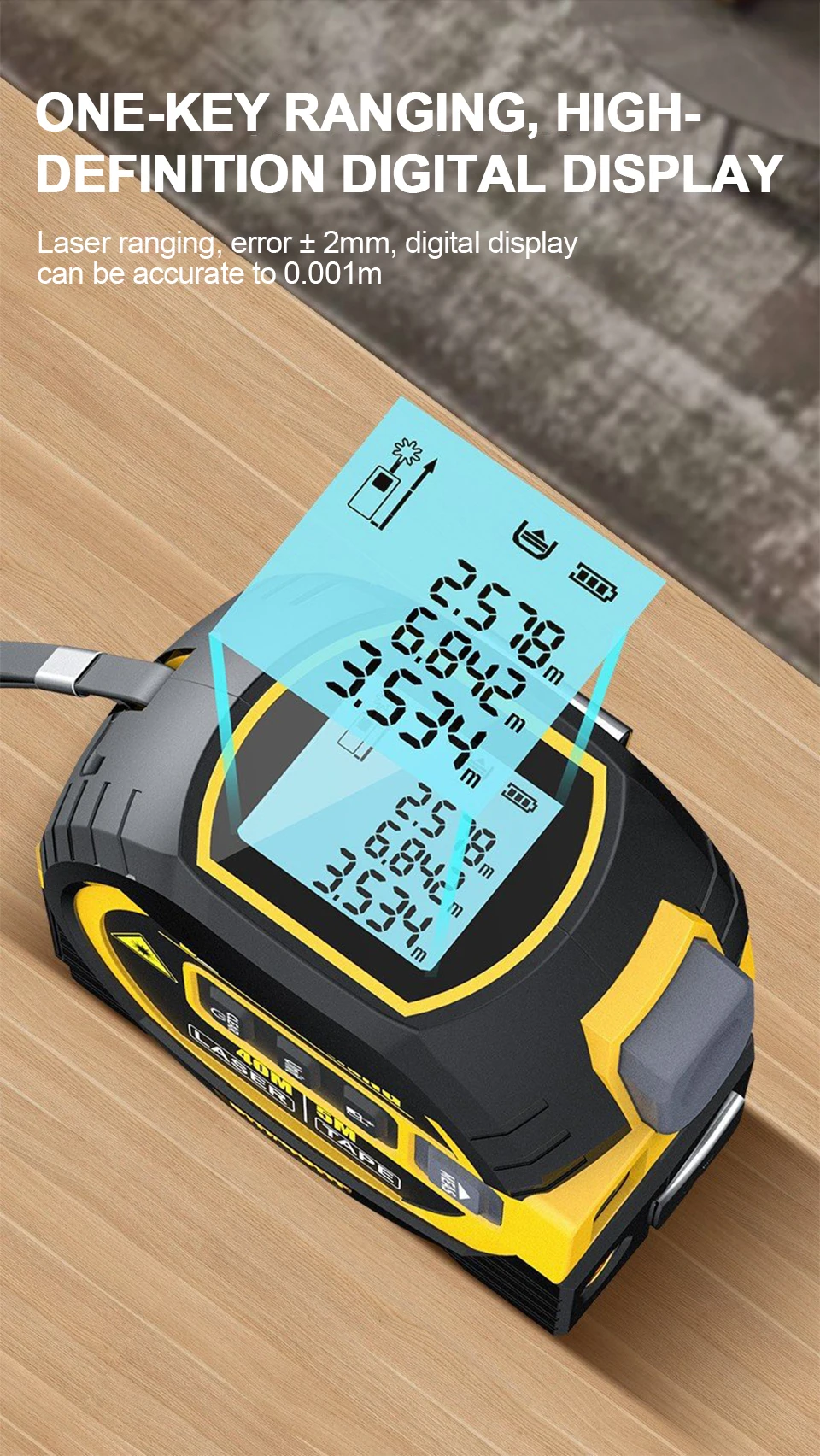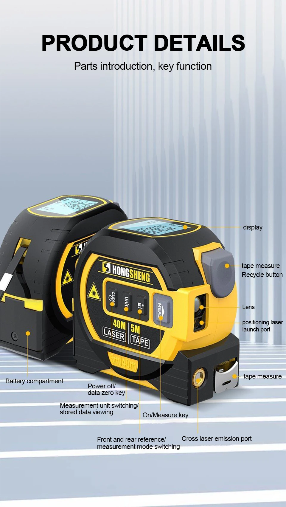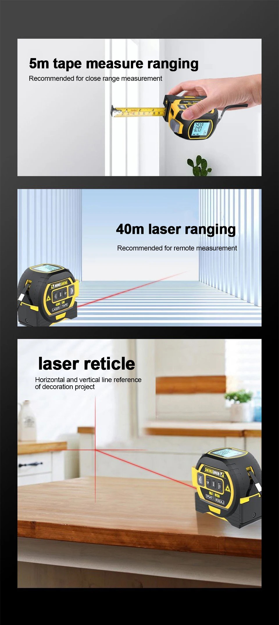 1. 3'ü 1 arada lazer mesafeli şerit metre: Kısa mesafe ölçümü için 5m şerit metre, uzun mesafe ölçümü için 40m lazer mesafe ölçümü, dikey yatay çizgi referansı için lazer retikül 2. LCD yüksek çözünürlüklü dijital