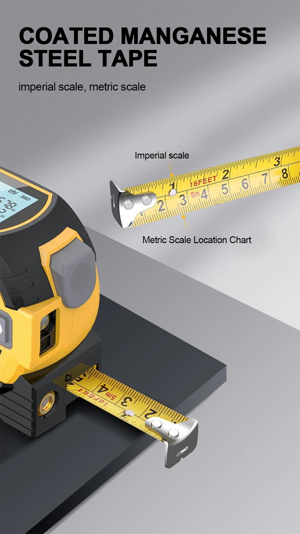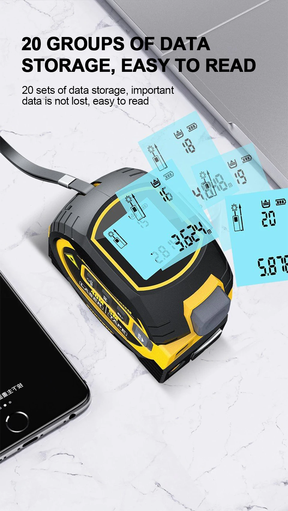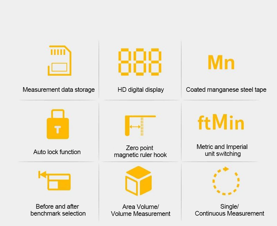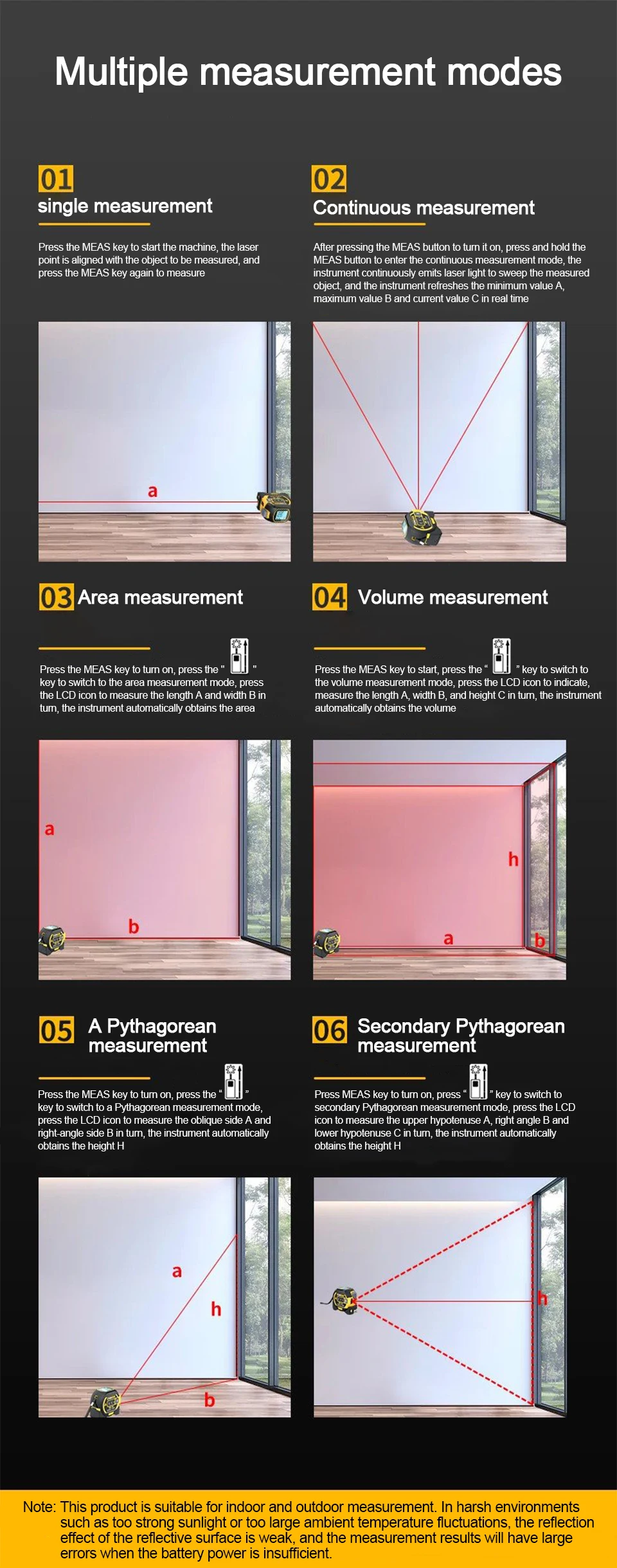 1. 3'ü 1 arada lazer mesafeli şerit metre: Kısa mesafe ölçümü için 5m şerit metre, uzun mesafe ölçümü için 40m lazer mesafe ölçümü, dikey yatay çizgi referansı için lazer retikül 2. LCD yüksek çözünürlüklü dijital